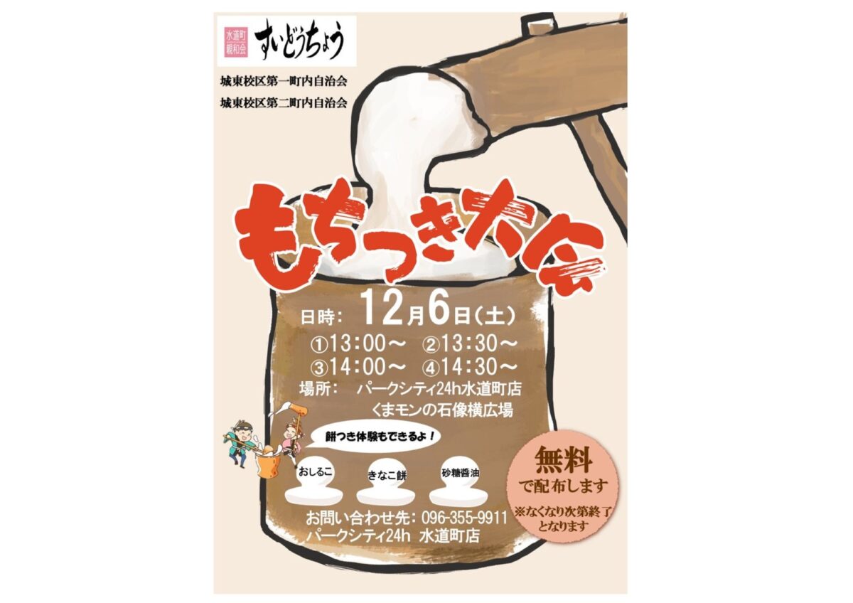 おしるこ・きなこ餅・砂糖醤油を無料で配布します。※なくなり次第終了となります。もちつき体験も出来るよ!