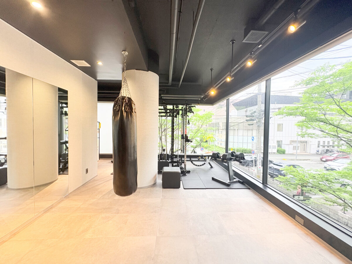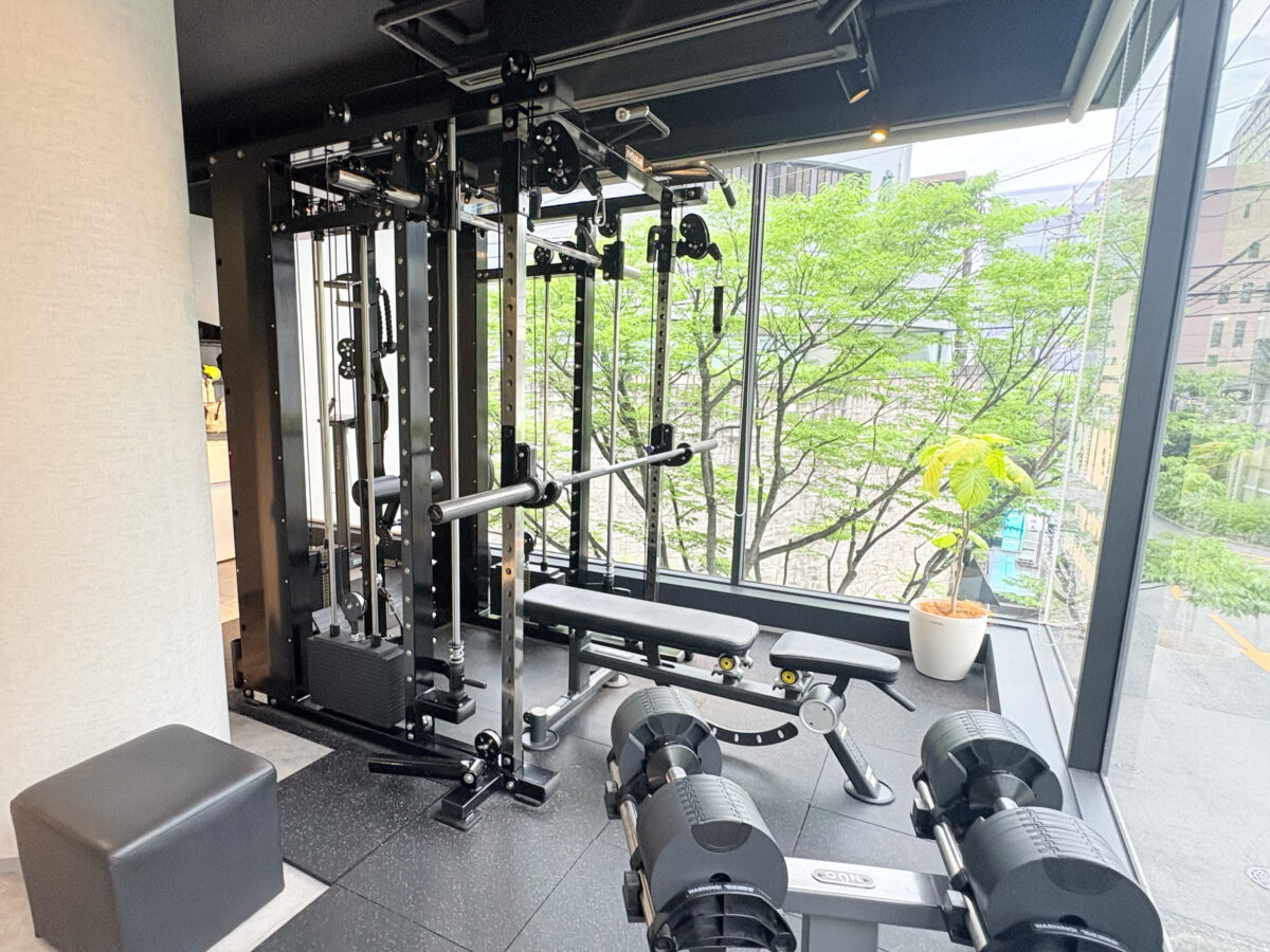 開けたスペースに加えて、トレーニングマシーンも完備。