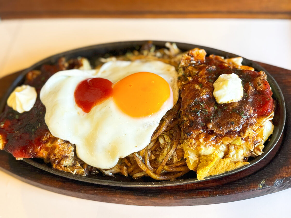 鉄板上にはお好み焼きと焼きそば、その上に目玉焼きが乗っている欲張りな一品。たっぷりとソースがしみ込んでいて絶品です。