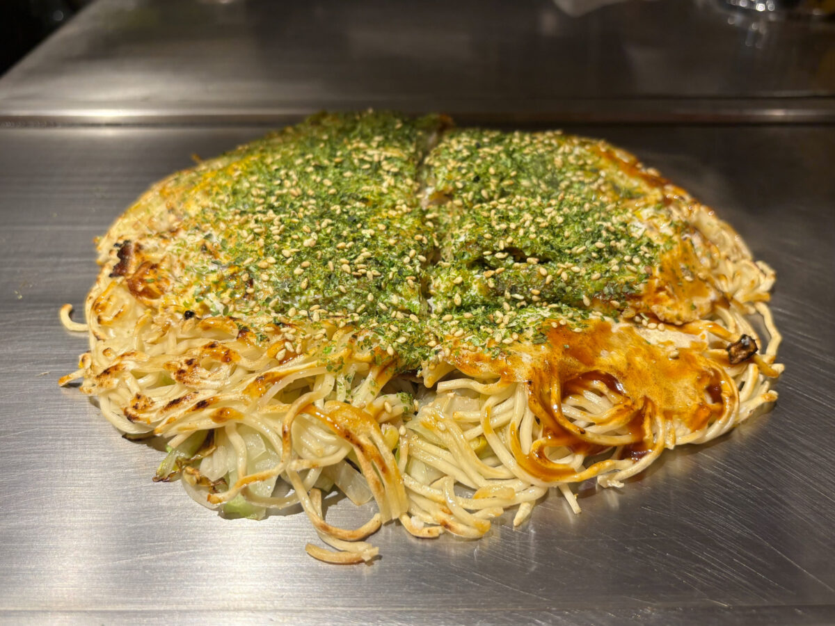 鉄板上にはお好み焼きと焼きそば、その上に目玉焼きが乗っている欲張りな一品。たっぷりとソースがしみ込んでいて絶品です。