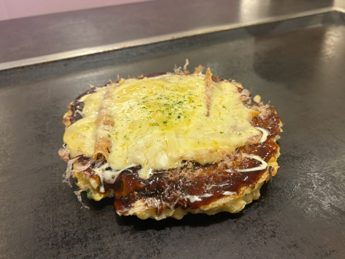 写真は豚玉大葉と大盛チーズ焼。その他にも創作お好み焼きも多数。