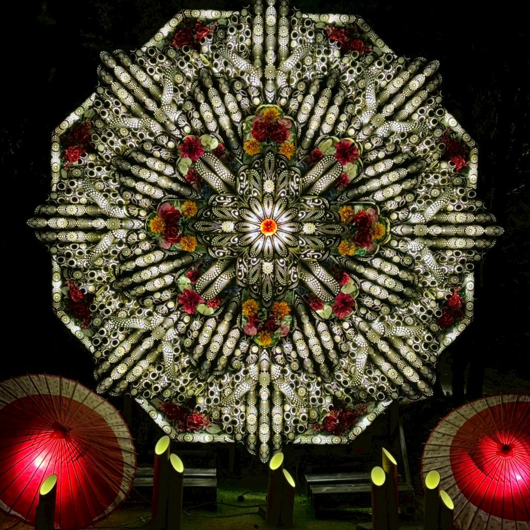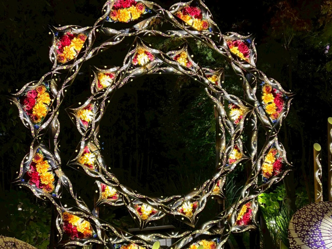竹以外にもカラフルな花を使ったモニュメントがあり、ただのイルミーションでなくアート。