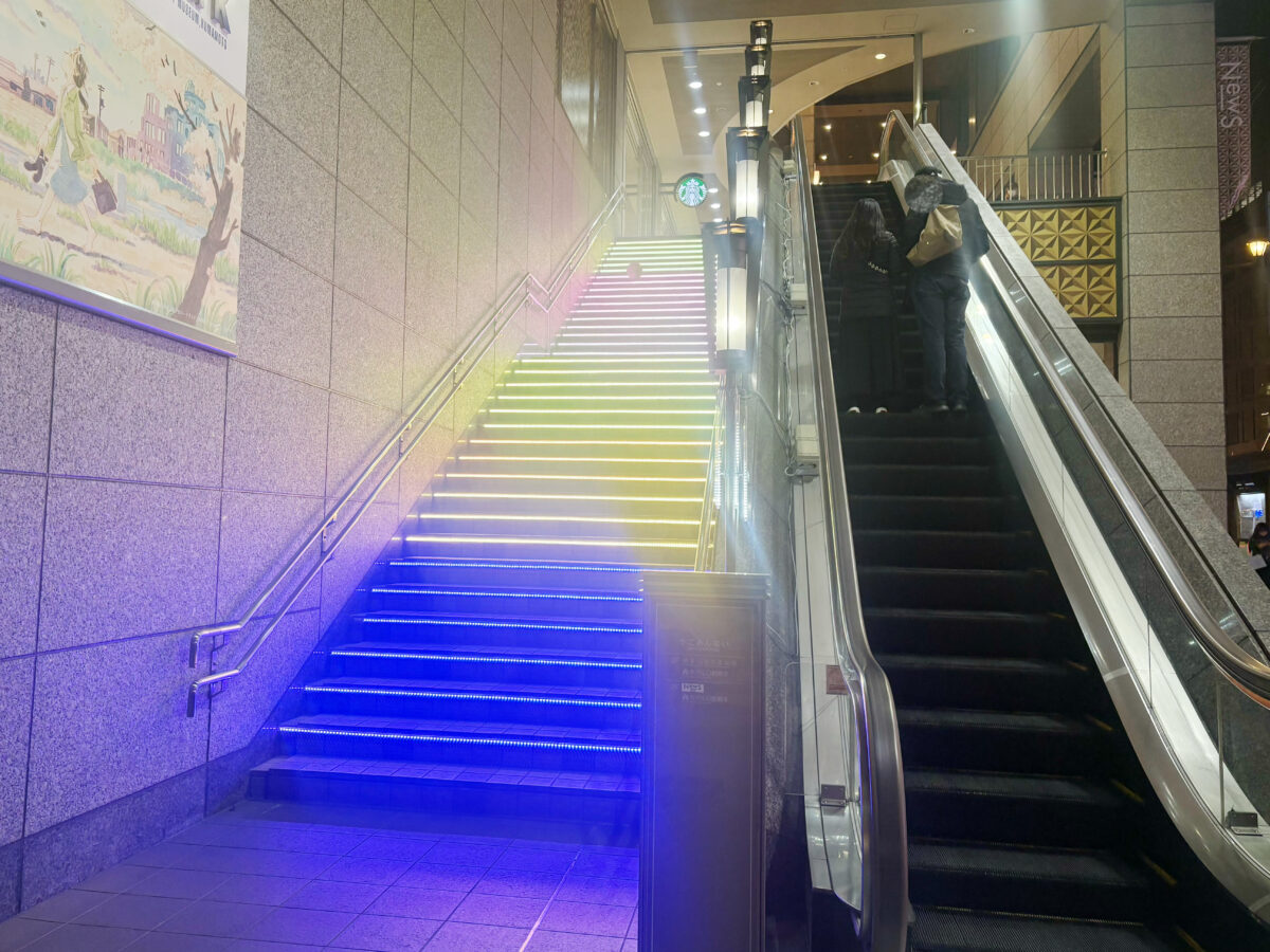 入口付近にクリスマスツリー。2階へ向かう階段はレインボーに輝いています。