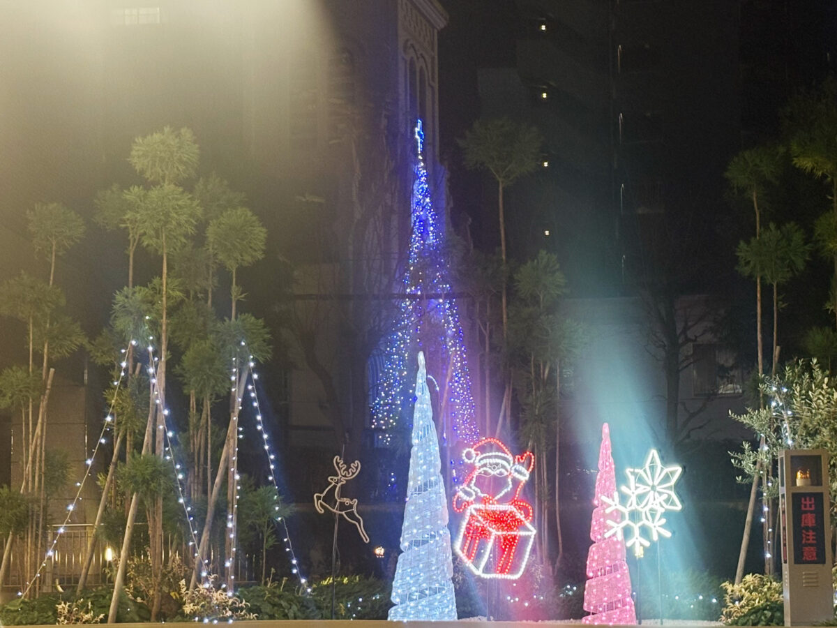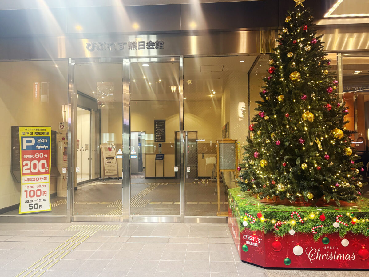 ホテル日航熊本のタクシー乗り場付近にはクリスマスツリーとサンタのイルミネーションがあってカラフル。