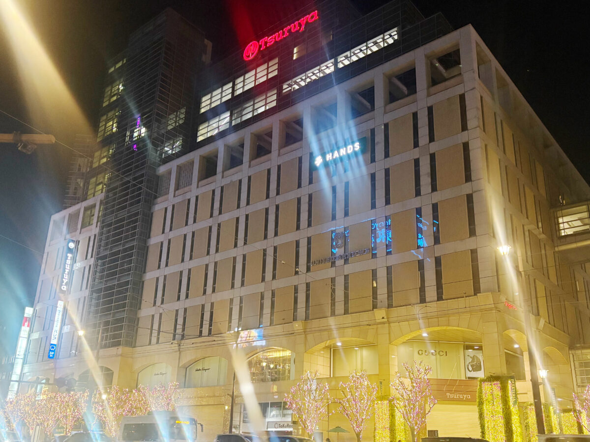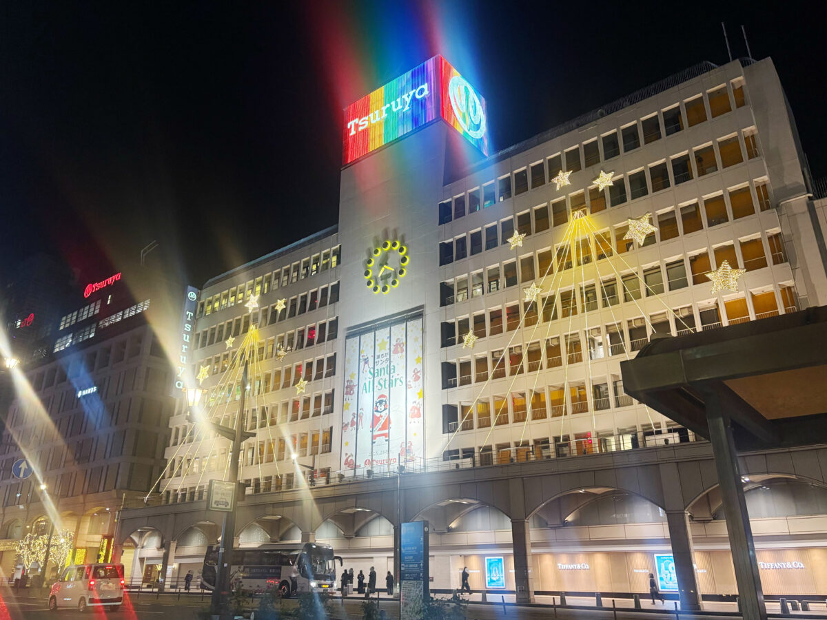 鶴屋百貨店の本館はロゴがレインボーに、クリスマスツリーを模した飾りも綺麗。東館はゴールドに輝く木々が華やかです。