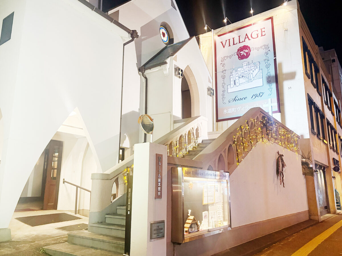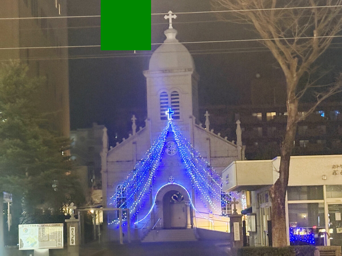 ホテル日航熊本の隣にあるカトリック手取教会は教会にイルミネーションがされており幻想的。