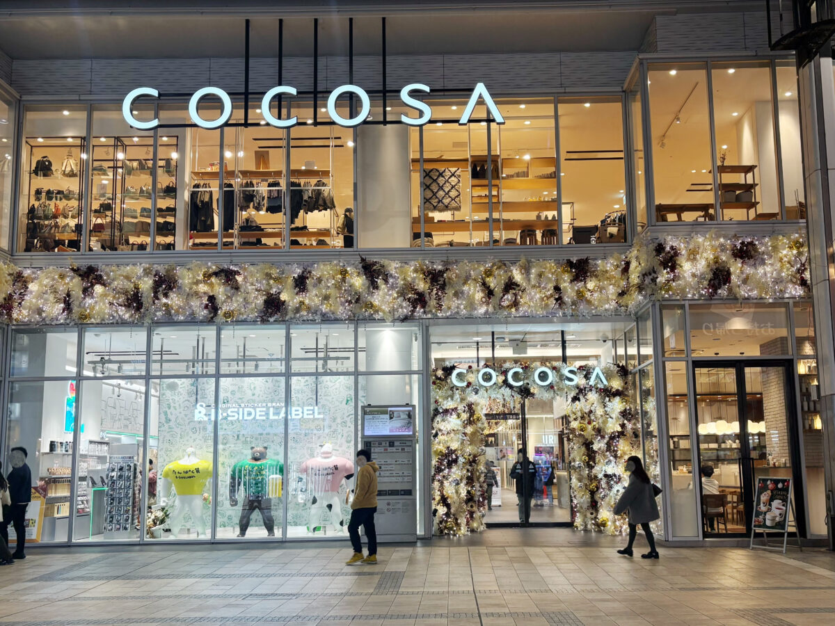 下通りアーケードにあるCOCOSAではお洒落な花の装飾がキラキラと輝いています。入口をぐるっと囲んだアーチも綺麗。