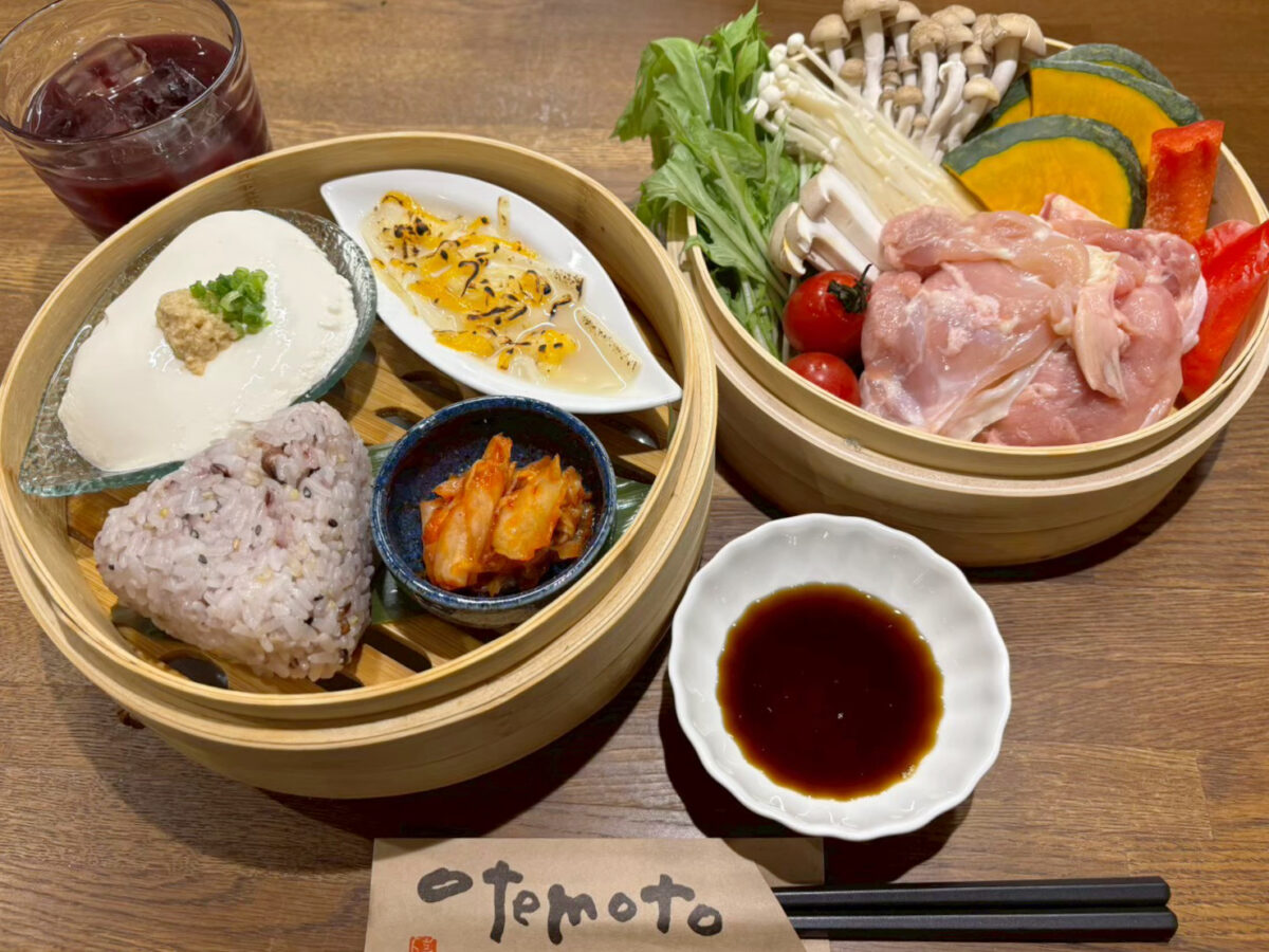 ランチには、セイロ蒸しの他に発酵野菜マリネ・甘酒アサイー食前酒・自家製国産豆腐・ターメリック豆乳野菜グラタン・十六穀米おむすびなど豪華な内容がセットになっています。
