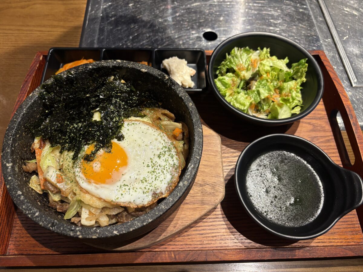 韓国料理で人気の石焼の器に入った丼。ごはんの上にはたっぷりの野菜と牛肉。