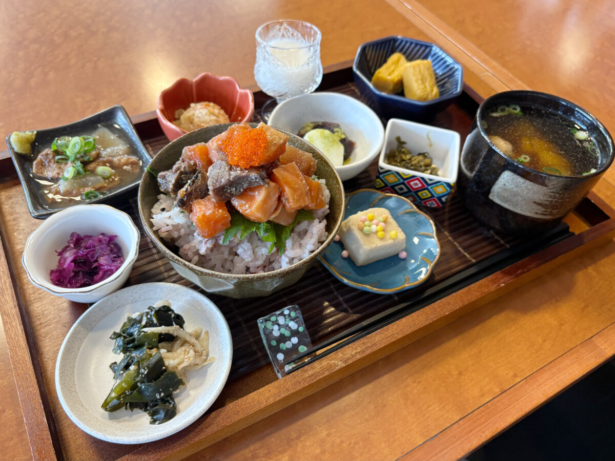 旬魚3種が乗った雑穀米の海鮮丼に10品がついた豪華な朝ごはん。馬すじ煮込みやだご汁など熊本名物も楽しめる内容。デザートまでついています。