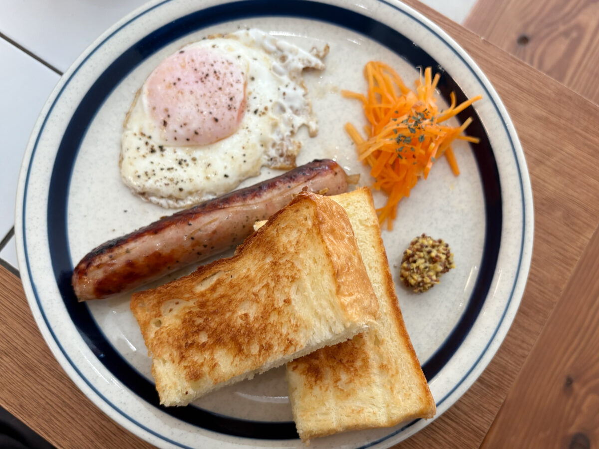 焼きたてのトーストにソーセージ、目玉焼きにキャロットラペがワンプレートで楽しめます。